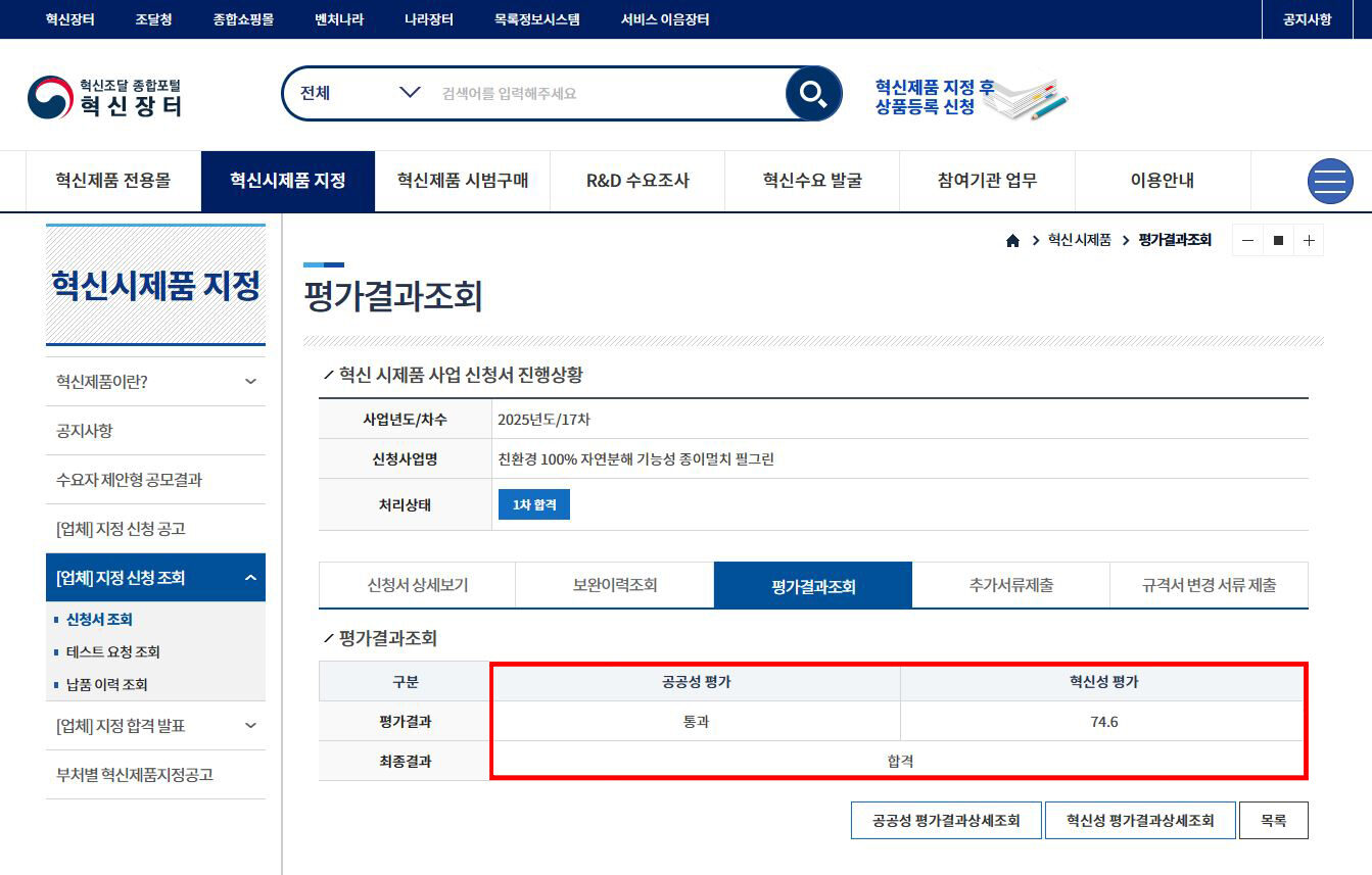 조달청 혁신제품 혁신성장지원분야(탄소중립) 혁신성평가 합격(2025-11-18)